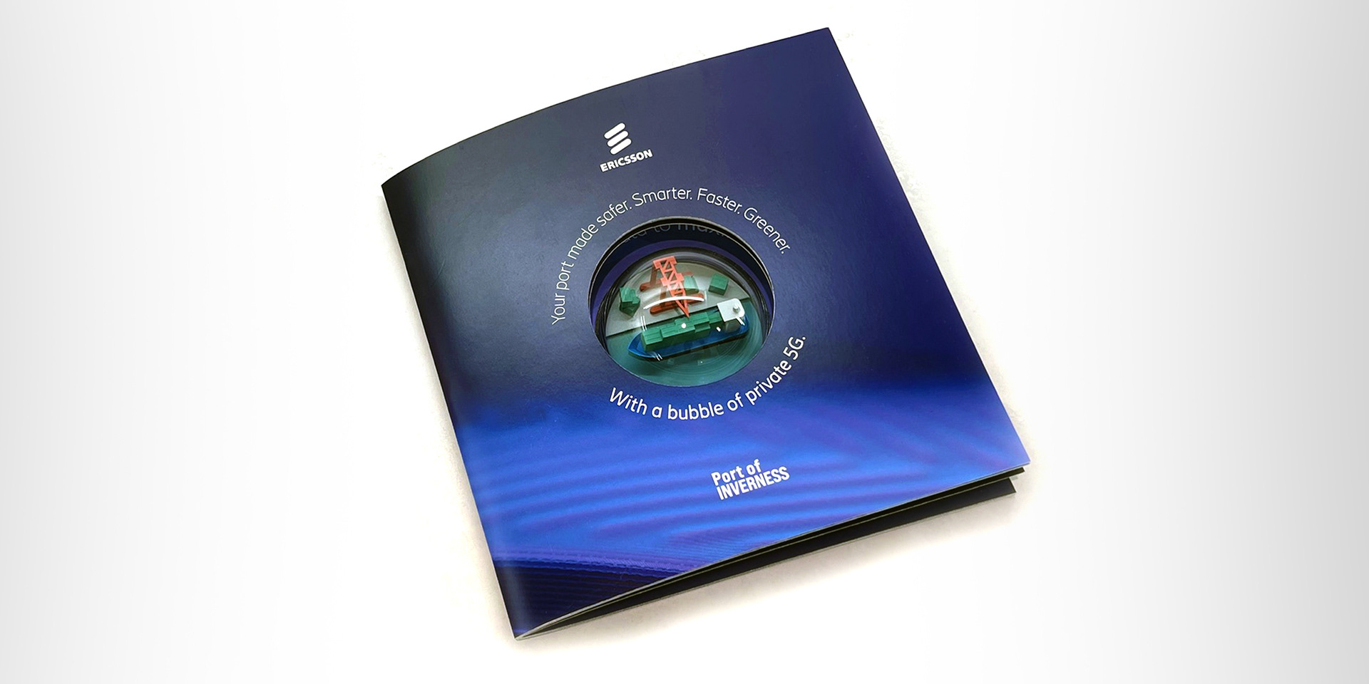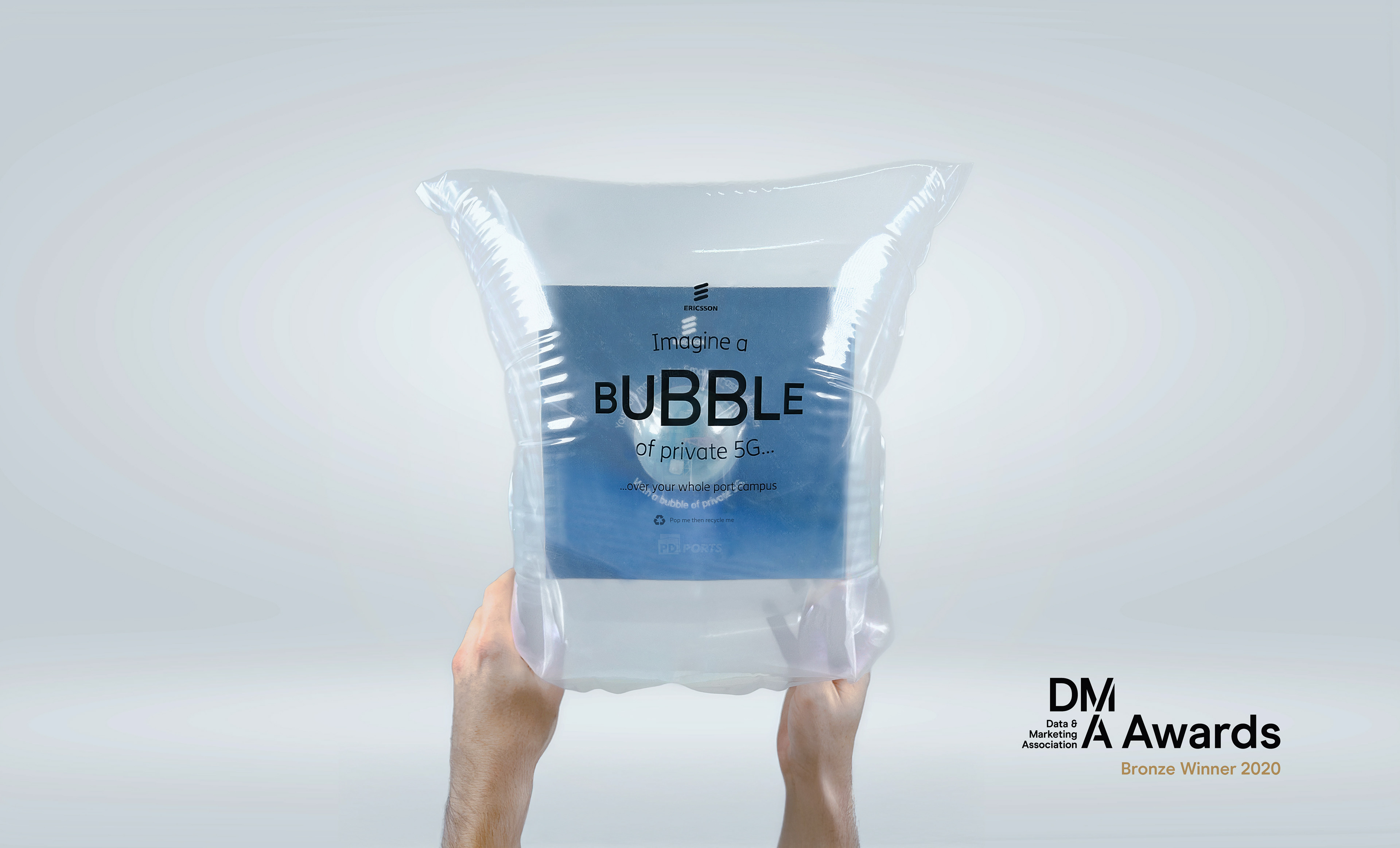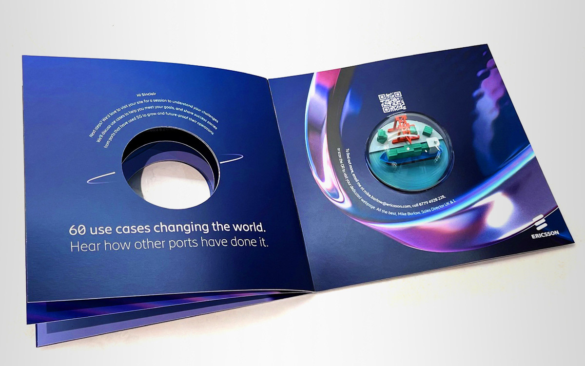 The direct mailer arrived in a bubble made of recyclable clear plastic with a strapline asking the recipient to ‘pop me’. Inside the bubble was a printed book featured a tiny 3D-printed model port under a ‘dome’ of private 5G.