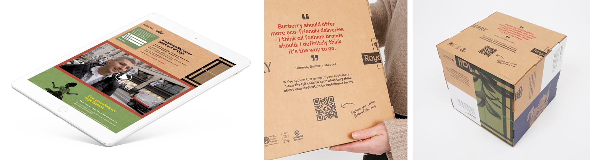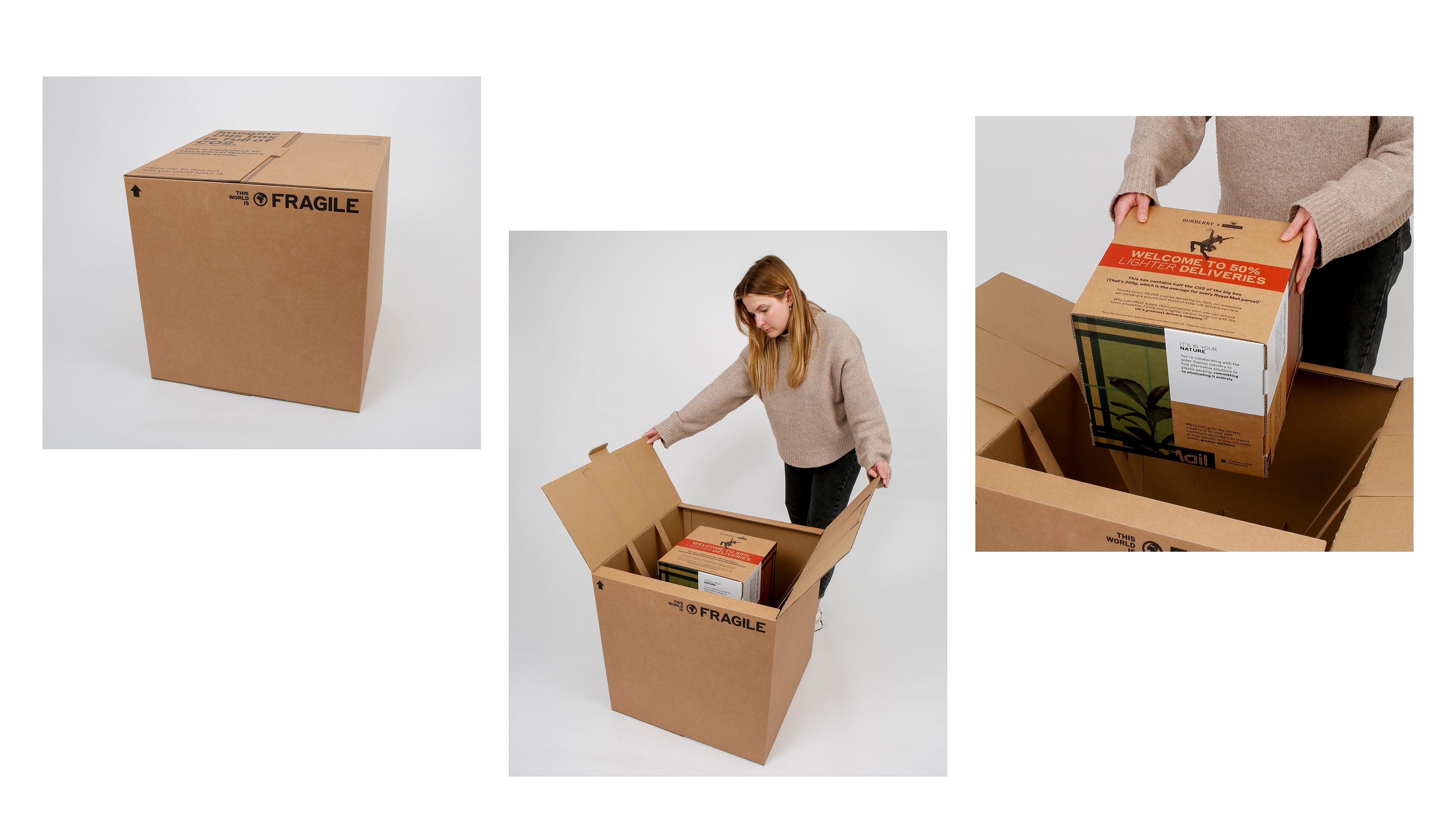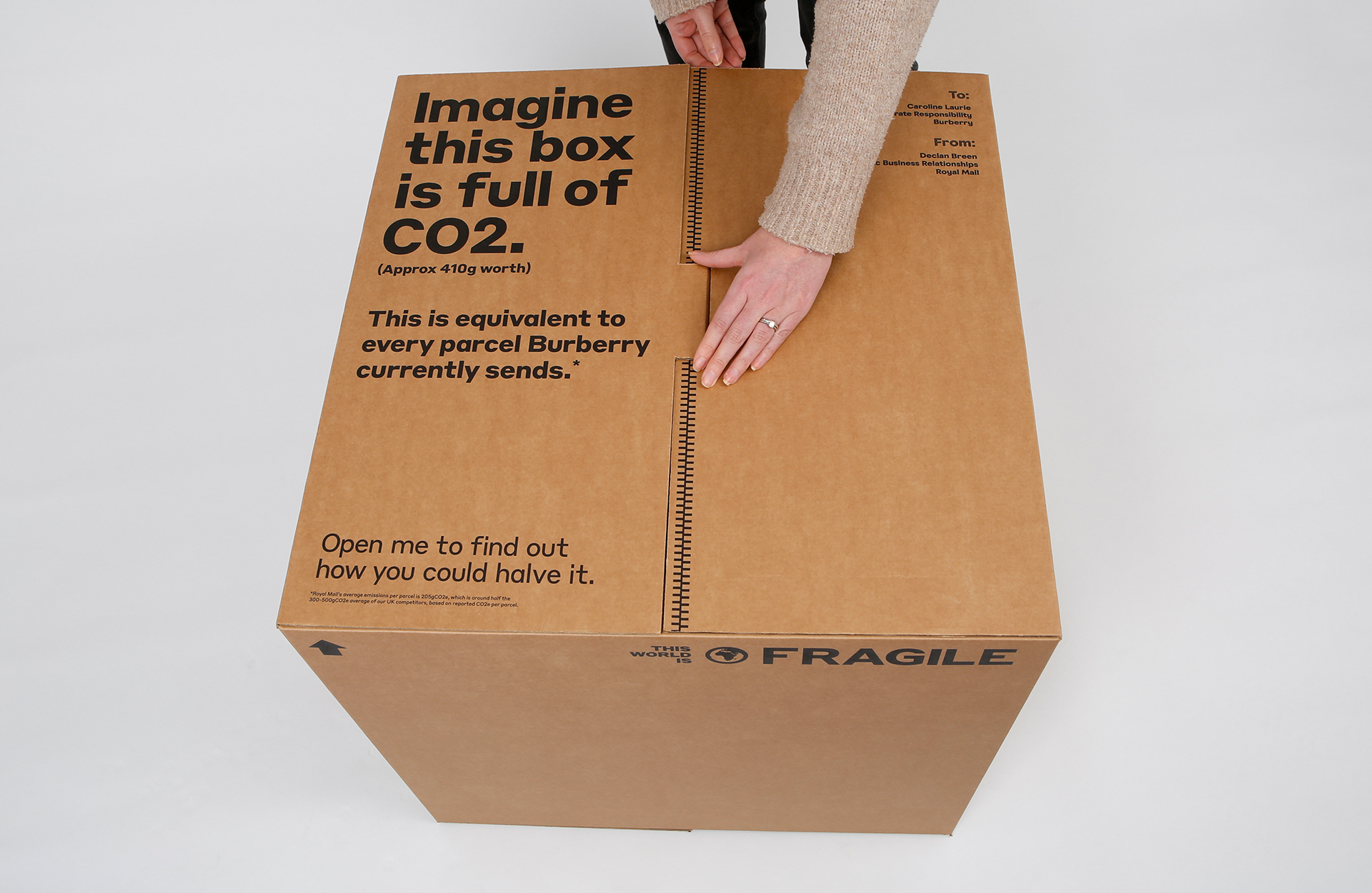 We developed a selection of highly sustainable, super personalised ‘boxes within boxes’ – the larger box the equivalent volume of CO2 produced in a typical delivery, and the smaller box half the size to showcase the approx. 50% less CO2 produced by a Royal Mail delivery.